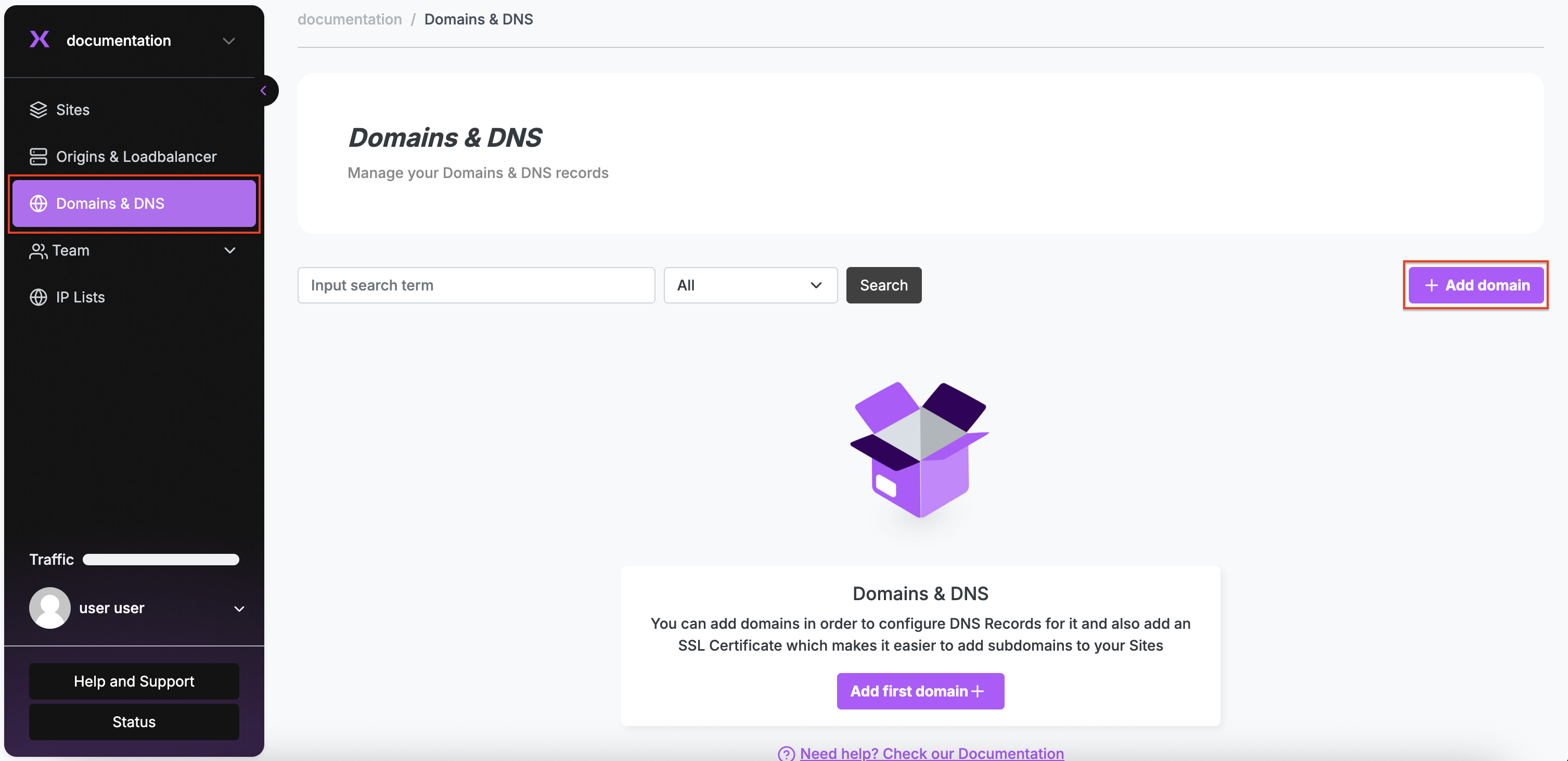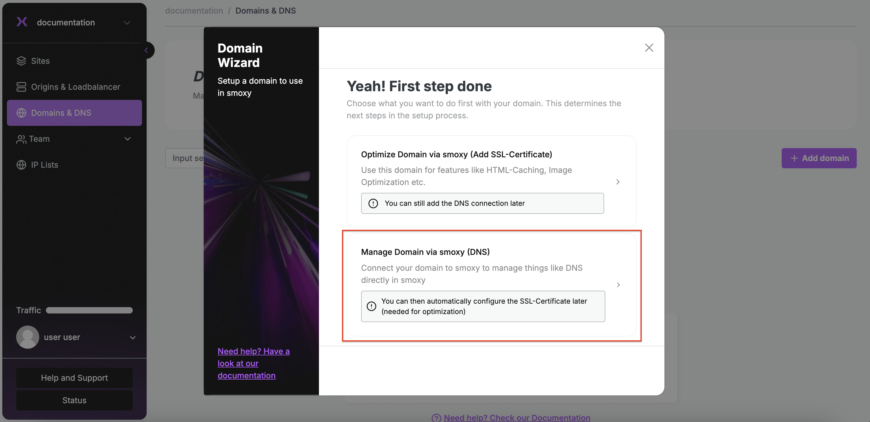 Öffne die smoxy-Oberfläche und wechsle in den Bereich „Domains & DNS“.